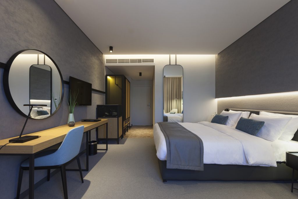 “The theme runs across the hotel worked within an area such as the room and combining different spaces of the hotel in others. For instance, the pool deck has a Mikonos theme to emulate an escape from the urban environment, and a relaxing place to spend time,” noted Chennoufi.